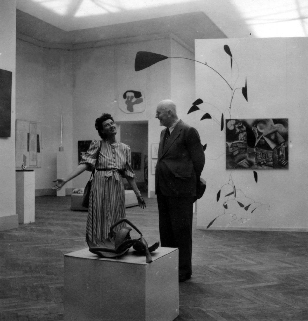 In her article about the 1948 Biennale for British Vogue, Lee Miller singled out Guggenheim’s exhibition for the highest praise, labelling it the “most sensational” pavilion of the year and commending the collector’s curatorial choices (“The Venice Biennale Art Exposition,” in Vogue, 1 November 1948, London, pp. 193-195). In a series of photographs taken during her visit to the pavilion, Miller recorded an enthusiastic meeting between Guggenheim and the great Italian art critic Lionello Venturi, during which Venturi was inspired to “swing the Calder Mobile for half an hour” (ibid.). “My exhibition had enormous publicity and the pavilion was one of the most popular of the Biennale,” Guggenheim proudly recalled. “I was terribly excited by all this, but what I enjoyed most was seeing the name of Guggenheim appearing on the maps in the Public Gardens next to the names of Great Britain, France, Holland, Austria, Switzerland, Poland… I felt as though I were a new European country” (op. cit., p. 329). Indeed, the success of the Guggenheim Collection with the public, and its cutting-edge selection of artists had a profound impact on Pallucchini’s view of modernism, opening his eyes to new movements, artists and ideas, that would directly influence the curatorial direction of the Biennale during his time as Secretary General.