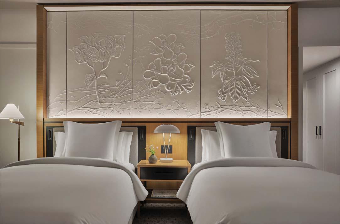 Working in collaboration with the client, Tara devised a novel approach: the artwork would come in the form of custom sculptural panels that would be showcased over each bed. To reference the local surroundings, the intricate bas-relief sculpture was inspired by photographs of flora native to the area and carved out of wood. A mold was then created by hand and the headboards were produced using a resin material to resemble plaster. This process ensured that a hand-crafted quality was maintained for each artwork, while enabling the 300+ pieces to be made efficiently and within budget. The resulting multi-panel headboard is now the show-stopping focal point of every guest room in the property.