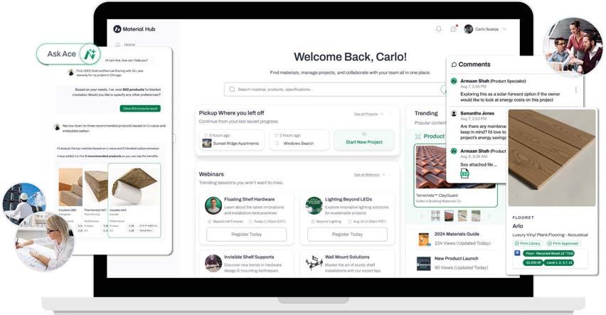 Beyond innovative products, this issue also contains details on innovative new processes. The Acelab Material Hub is upending the fragmented and chaotic design process with a comprehensive materials management and specification platform. AP contributing editor Barbara Horwitz-Bennett interviewed Vardhan Mehta, aia, csi, co-founder & CEO, Acelab. He shared that the idea for Acelab came from “realizing that architects were making billiondollar decisions with consumer-grade research tools.” Mehta set out to make it easier for architects to connect with more of the products that were available to them and to more easily find the product best suited to a project’s needs. Start learning about The Power of Acelab on page 14.