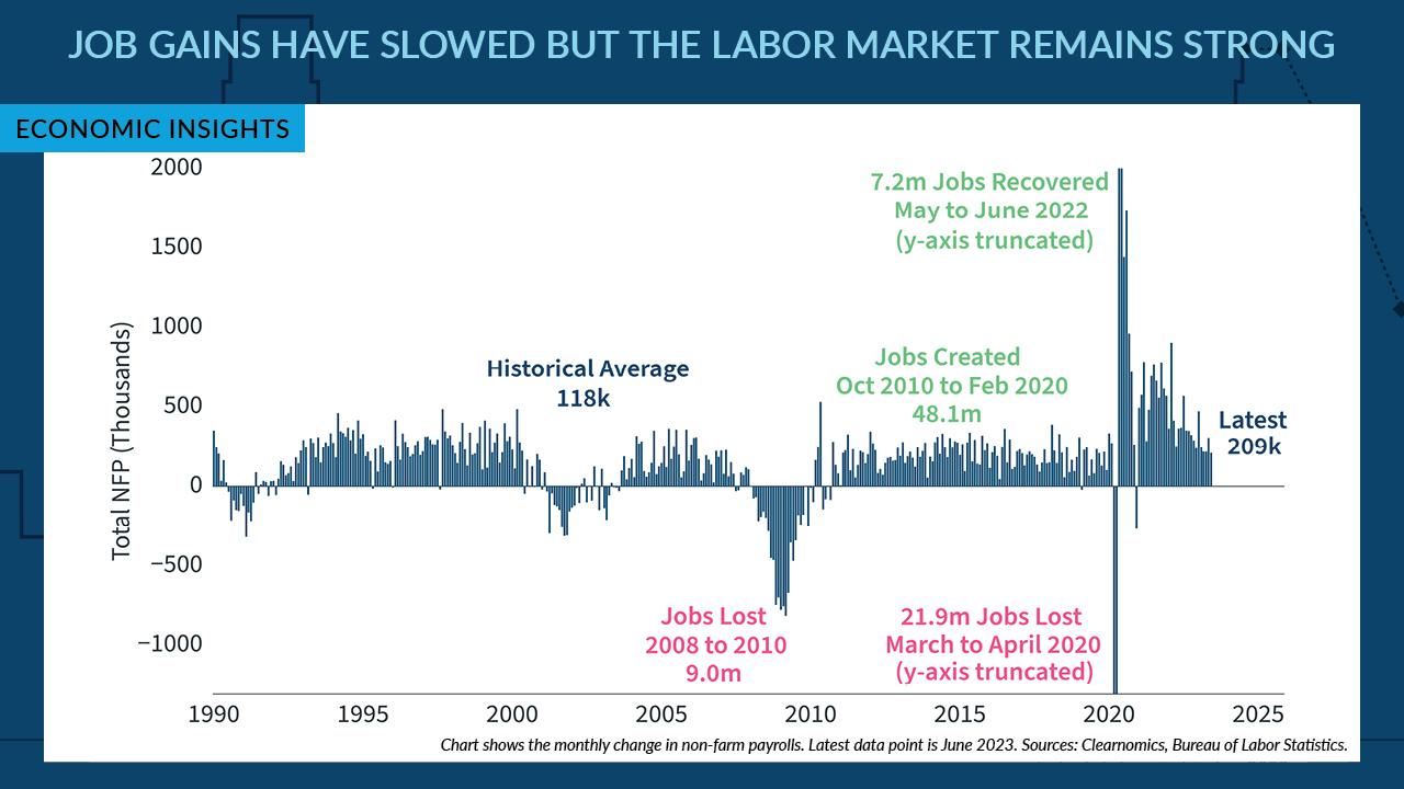 Although hourly earnings surprised economists by growing 0.4% month over month, June payroll data continued to show slowing labor market growth over the past year. Inflation continues to be stubborn –a reason the Fed increased interest rates in July and may do so later in 2023.