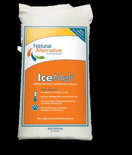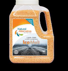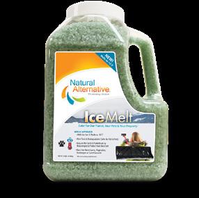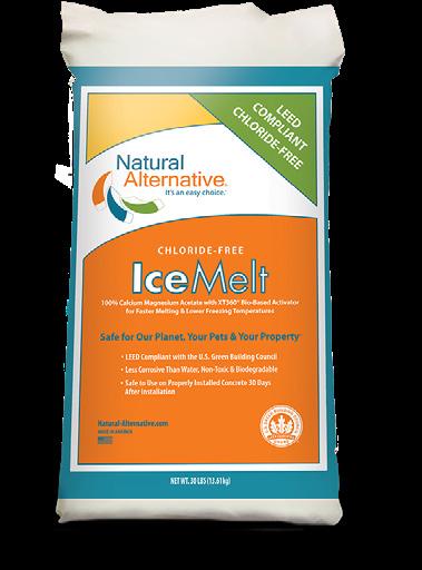 Natural Alternative 100% CMA Ice Melt is chloride-free, nontoxic, and biodegradable. Less corrosive than tap water, it is safe for concrete, pets, lawns, and waterways; meets LEED standards; and will not burn paws or turf. www.natural-alternative.com