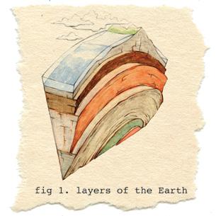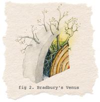 This image, an abstract representation of Venus as described in “All Summer in a Day,” shows an imagined depiction of Venus’s core, mantle, crust, vegetation, and atmospheric conditions.