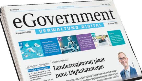eGovernment ist die Zeitung für die Digitalisierung der Verwaltung und Öffentliche Sicherheit. Sie informiert ITEntscheider in Bund, Land, Kommune und in den Öffentlichen Einrichtungen über alle fachlich relevanten Bereiche der digitalen Informationsverarbeitung im Public Sector. Das Onlineportal www.eGovernment.de stellt maßgeschneiderte Services für IT-Entscheider der Öffentlichen Hand dar und bietet ein umfangreiches, exklusives Webangebot mit hohem Nutzwert. Das Stammhaus Vogel IT-Medien, Augsburg, ist eine 100prozentige Tochtergesellschaft der Vogel Communications Group. Der führende deutsche Fachinformationsanbieter mit rund 100 Fachzeitschriften und 60 Webseiten sowie zahlreichen internationalen Aktivitäten hat seinen Hauptsitz in Würzburg. Die wichtigsten Angebote des Verlages sind IT-BUSINESS, eGovernment, Healthcare-digital.de, BigData-Insider. de, CloudComputing-Insider.de, DataCenter-Insider.de, Dev-Insider.de,