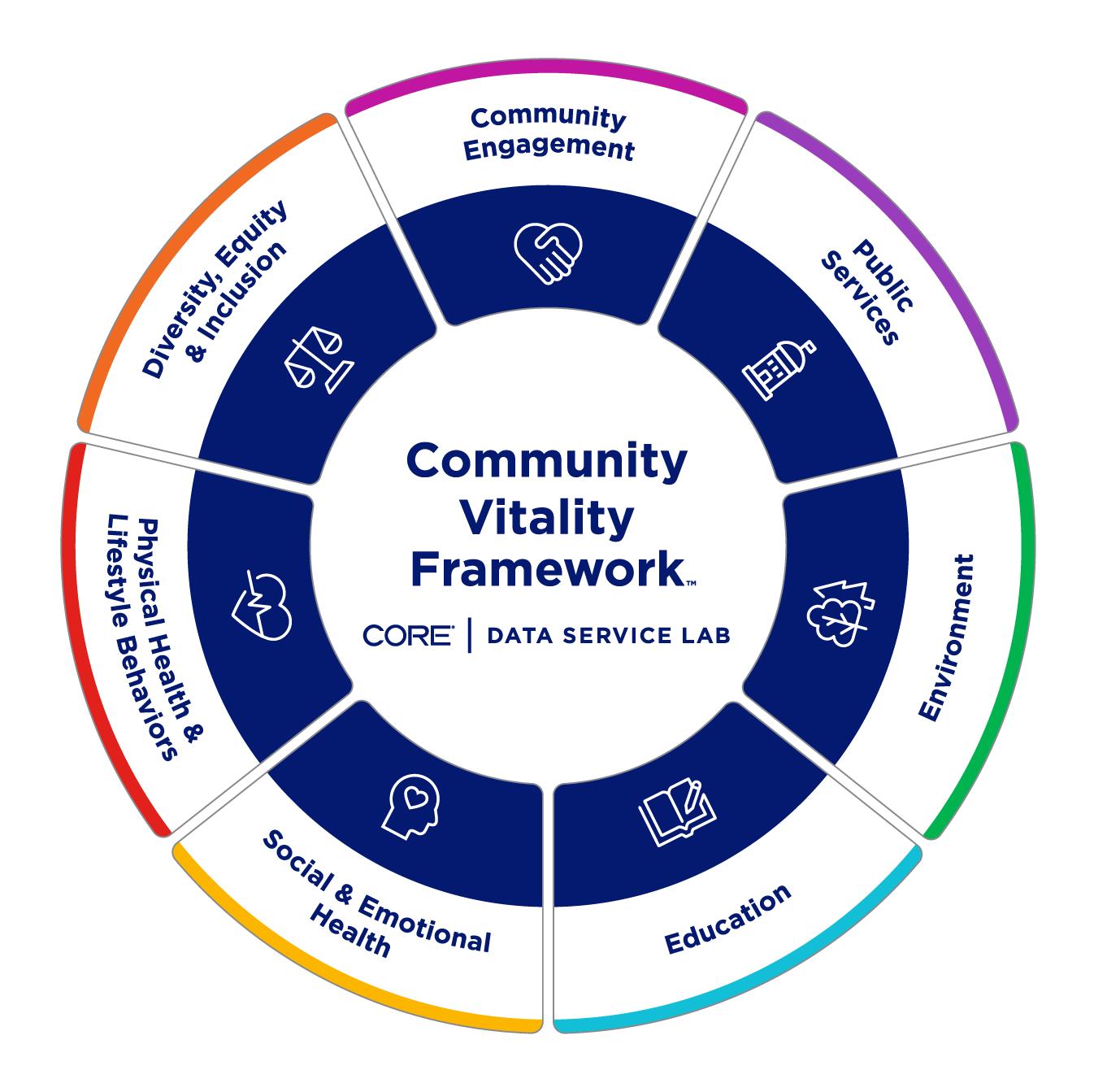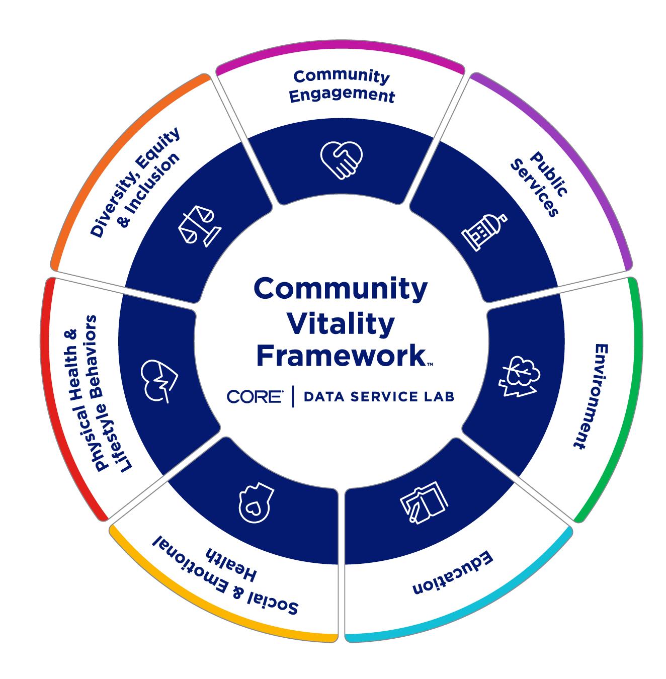 The Community Vitality FrameworkTM categorizes this idea into 7 domains. It focuses on people — their identities and connections — while also highlighting the qualities that make communities vibrant and livable. This flexible framework supports tailored data storytelling, enabling stakeholders to engage with communityspecific insights.