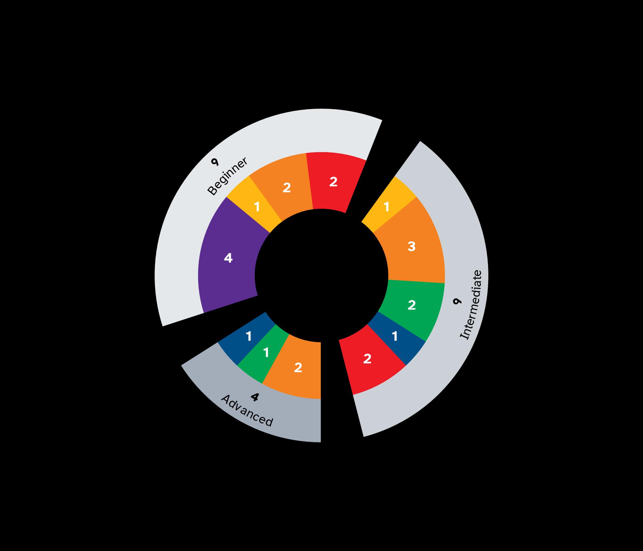 • 2 have a beginner level of challenge, 3 are intermediate, 2 are advanced