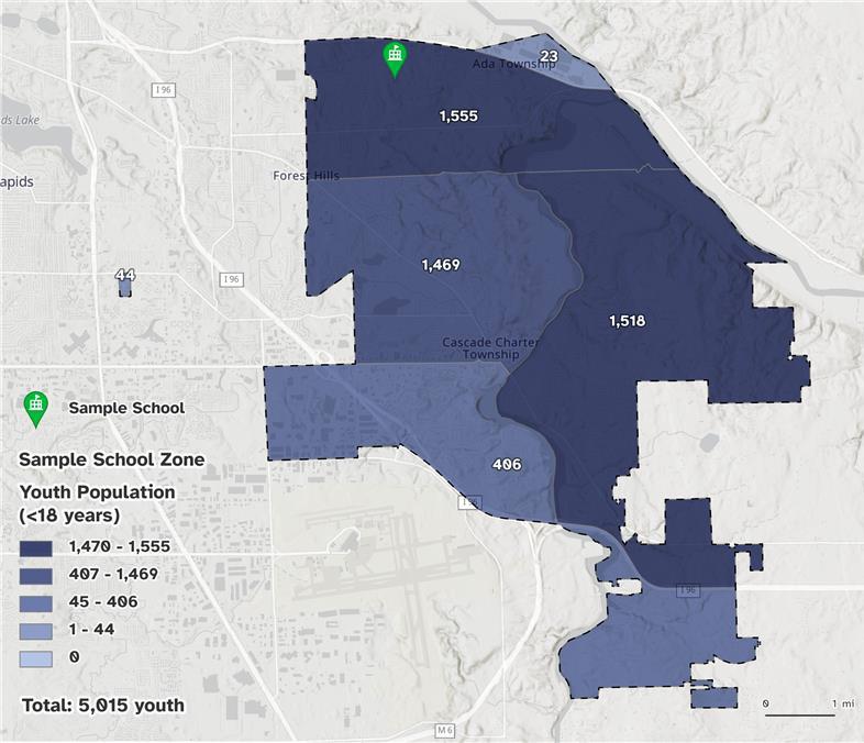 Map shows the number of youth (<18 years) per census tract within your school zone. Your school plays a vital role in students’ development by providing a high-quality outdoor space for physical activity, mental restoration, and meaningful connections.