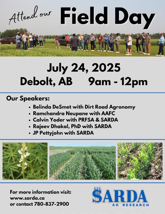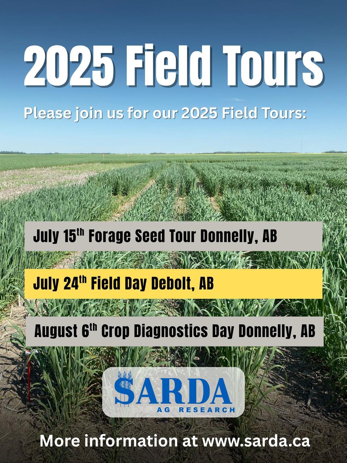 We are excited to host several field tours throughout the growing season. Our first event, the Forage Field Day, will take place on July 15, 2025, in Donnelly at the SARDA shop and nearby field sites in the Whitemud Creek area. Additional events include our Field Tour in Debolt on July 24, 2025 and our main Field School & Crop Diagnostic Day in Donnelly on August 6, 2025. More information will be provided on these tours via SARDA Ag Research email. Sign up on the back page of this newsletter.