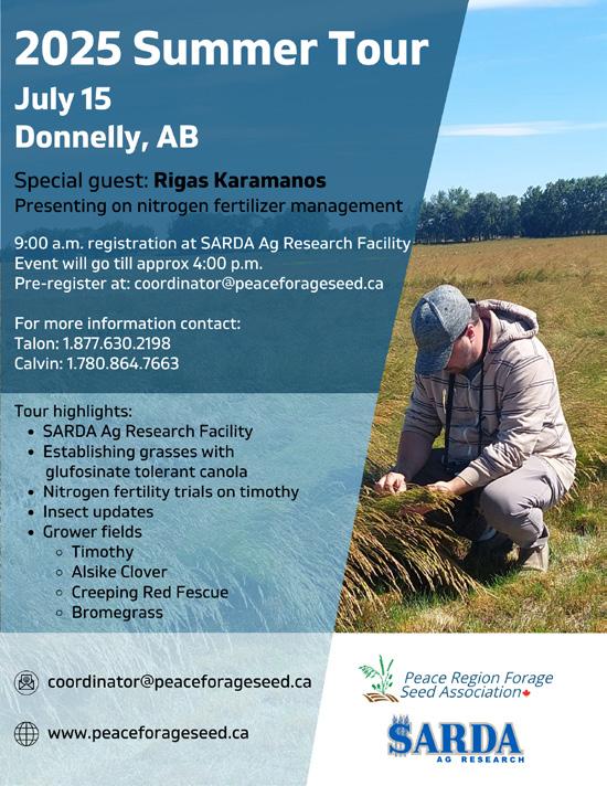 Peace Region Forage Seed Association field tour will be held on July 15th in the Donnelly and Whitemud areas looking at a number of timothy, clover, creeping red fescue and bromegrass fields and trials.