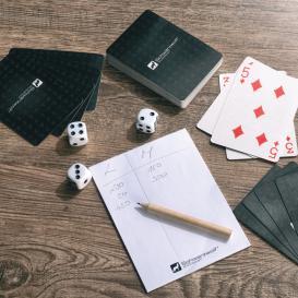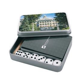 Schwarzwolf travel set of playing cards and dice in a tin box. You will certainly welcome this set, for example during your camping trip, when you and your friends will be able to enjoy the evening with a fun game or just at home with your family. The set includes 2 × 54 playing cards with a water repellent surface treatment, 6 dice, 15 note papers and a pencil. Packed in a gift box. Recommended printing technology: UV print