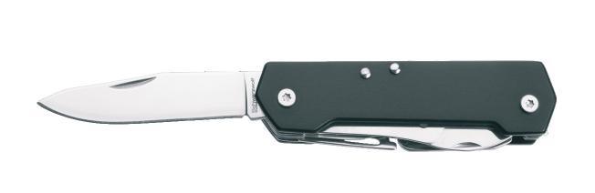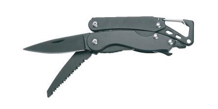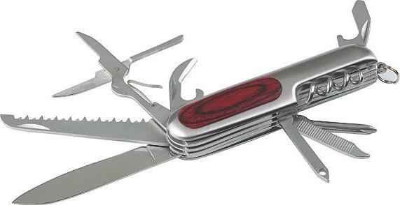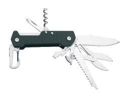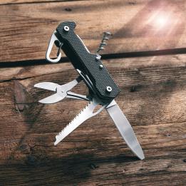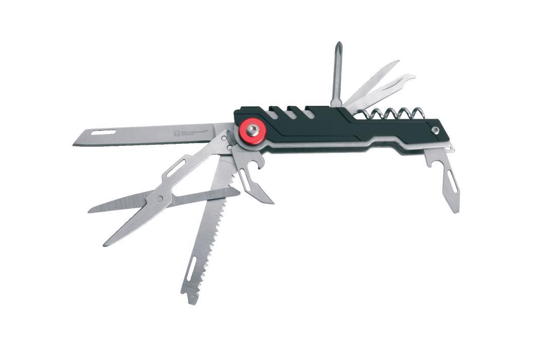 Multifunctional Schwarzwolf pocket knife. Includes 9 tools – knife, scissors, saw, corkscrew, bottle opener, can opener, flat screwdriver, phillips screwdriver and carabiner. The handle of knife is in a modern grooved design on the one side and has a smooth surface for your logo printing from the other side. Packed in a gift box.