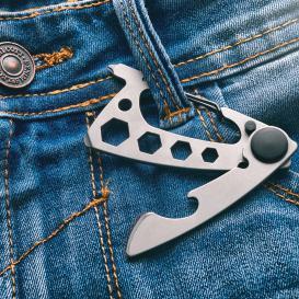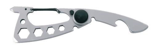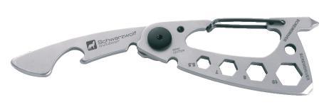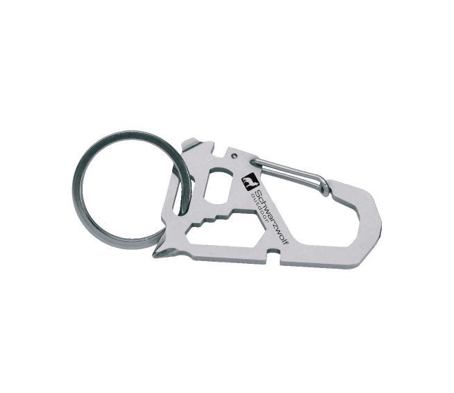 Multifunctional Schwarzwolf tool with 10 functions. It has a carabiner, bottle opener, multifunctional opener, wire cutter, slot head screwdriver, Phillips head screwdriver and spanner (4 sizes). Packed in a gift box. Material: stainless steel 420 Recommended printing
