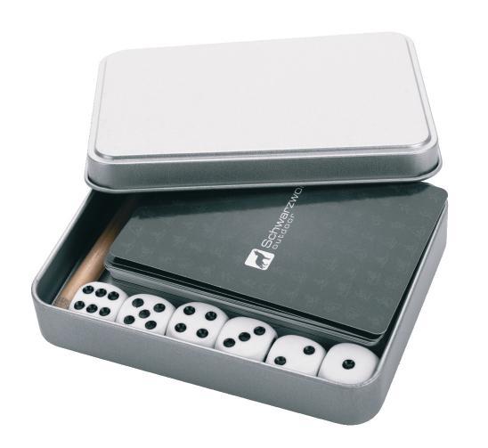 Schwarzwolf travel set of playing cards and dice in a tin box. You will certainly welcome this set, for example during your camping trip, when you and your friends will be able to enjoy the evening with a fun game or just at home with your family. The set includes 54 playing cards with a water repellent surface treatment, 6 dice, 15 note papers and a pencil. Packed in a gift box.