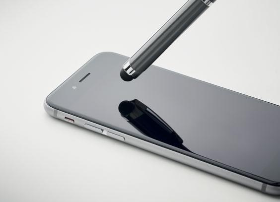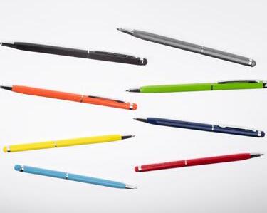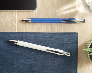 Push button stylus pen in aluminium. When the logo is engraved on to the barrel, the colour revealed matches the colour of the touch tip. Blue ink.
