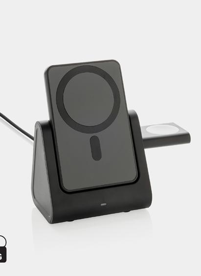 3-in-1 wireless charger with powerbank dock made with RCS, ABS and RCS recycled PC. Total recycled content: 59% based on total item weight. RCS certification ensures a completely certified supply chain of the recycled materials. The wireless charger comes equipped with a magnetic 5W wireless charger and an additional 5W wireless charger suitable for earbuds cases or other small wireless chargeable devices and a 2.5W wireless charger for smartwatches (Apple watches only). Including RCS certified 120 cm recycled TPE cable. Packed in FSC® mix packaging. Item and accessories 100% PVC free. Input: 5V/2.4A for optimal use. Output: Phone: 5V/1A Earbuds: 5V/1A, Watch: 5V/0.5A. PVC free.