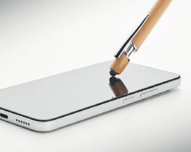 Stylus push button ball pen with bamboo finish. Blue ink.