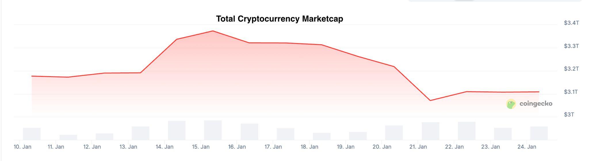 比特幣於 1 月 14 日觸及 97,850 美元,創下近兩個月新高。然而,在隨後一週 內 ,BTC 幾乎回吐年初以來的全部漲幅,價格自高點回落 10.8% 以上,並下探至目前形 成的新支撐區域。