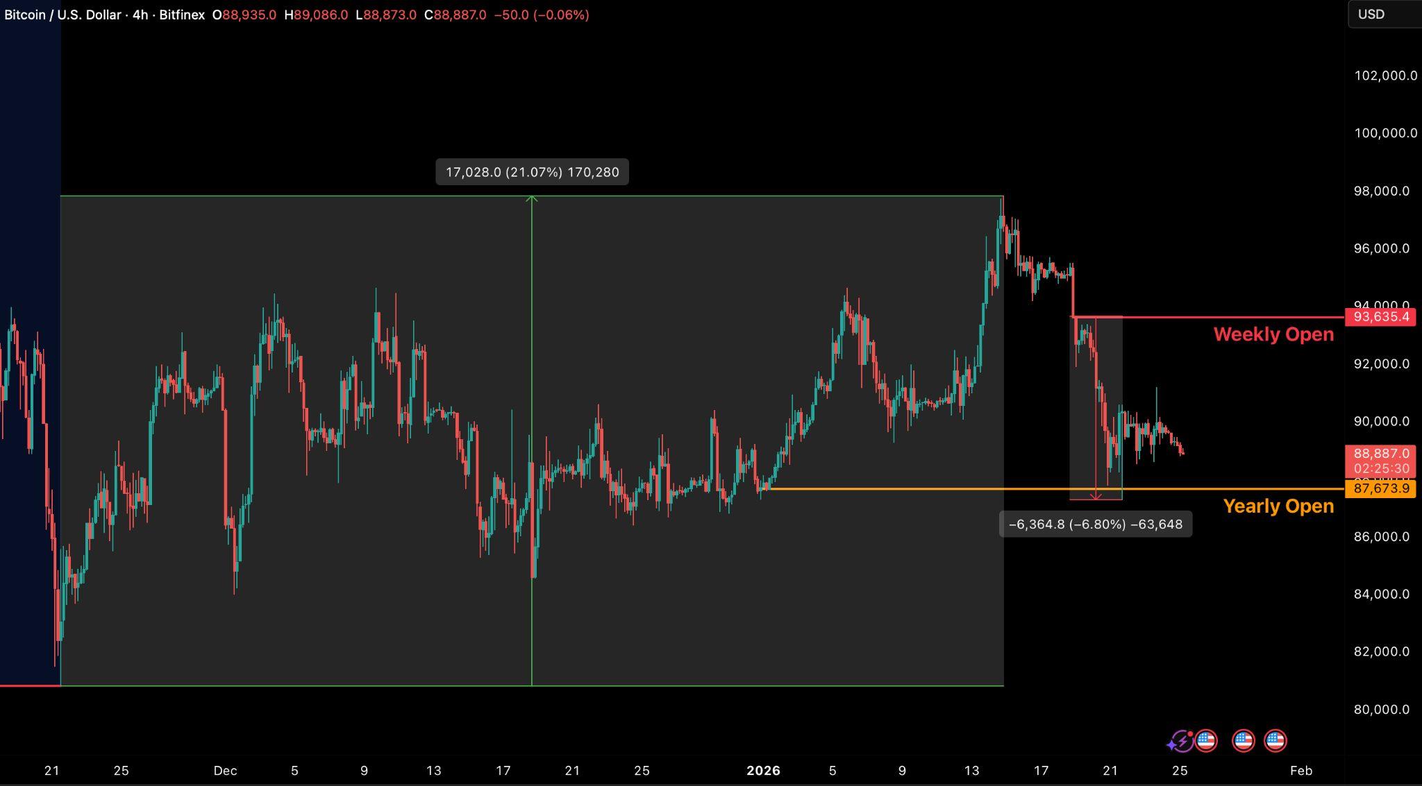 自 2025 年 10 月 6 日於 126,110 美元創下歷史高點後,BTC 已經歷本輪週期中最深的 一次修正,高點至低點跌幅接近 36%。儘管如此,近期價格行為仍構成一個值得關注的轉 折點:在一度較近期低點反彈超過 21% 後,BTC 再度回落 10.8%,目前較週初開盤價下 跌 6.8%。這代表價格未能成功收復 2025 年年初開盤價,該水位先前曾作為重要的市場 結構樞紐。