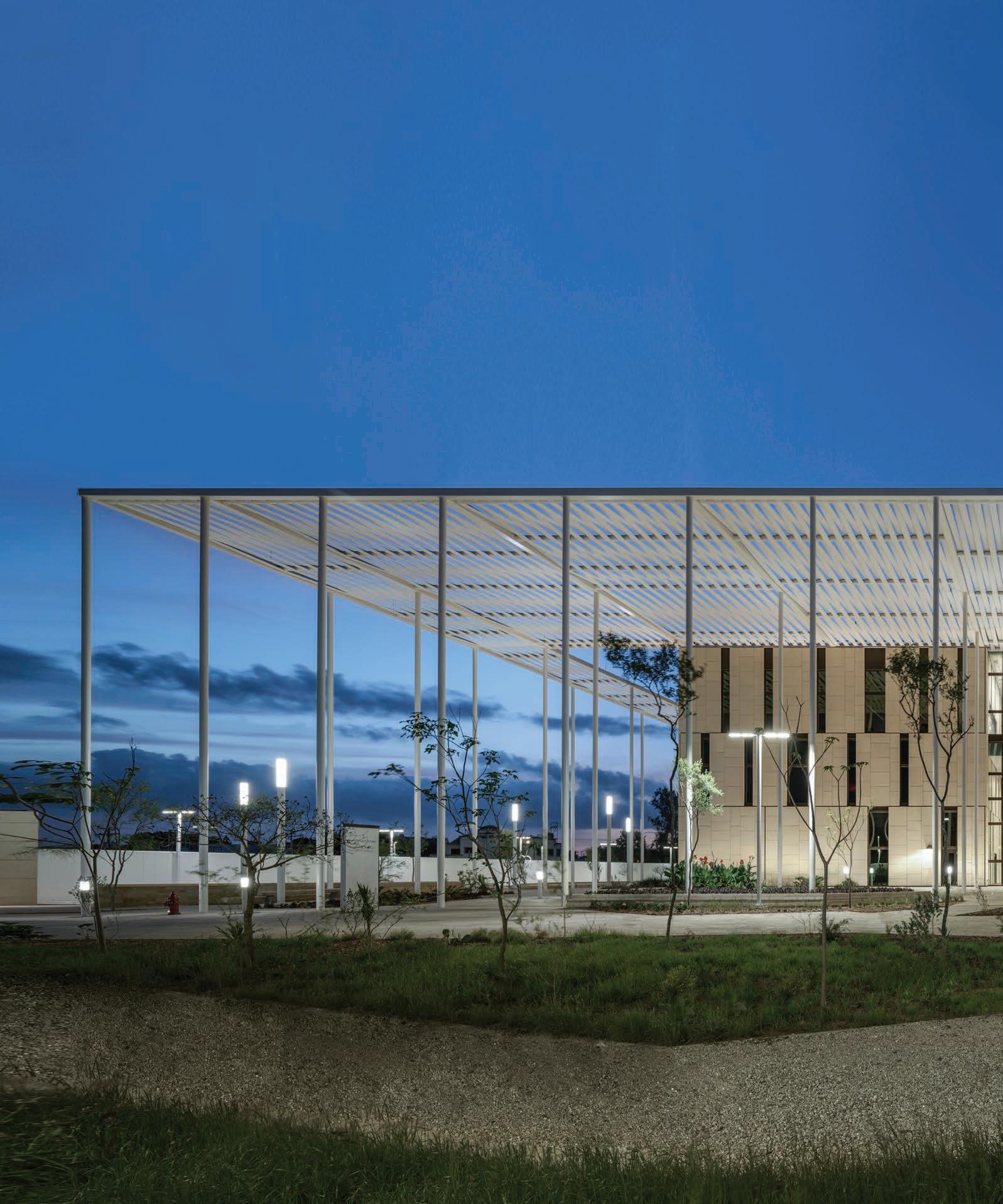 The façade panels consist of an internal structure made of a 3D-printed carbon-fiber material. This structure is then encased by an expanding foam and robotically machined into organic shapes— shapes approximating those found in nature. After being coated with glass-fiber reinforced concrete, the panels are installed—in this case, on three sides of the parking structure. The outcome is an energyefficient façade that is lightweight and durable.