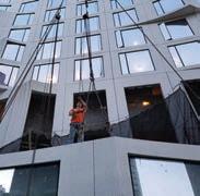 To affix the panels to the structure’s frame, both types were hoisted into position and connected for lateral and gravity support at the floor slab with multiple galvanized steel anchor assemblies.