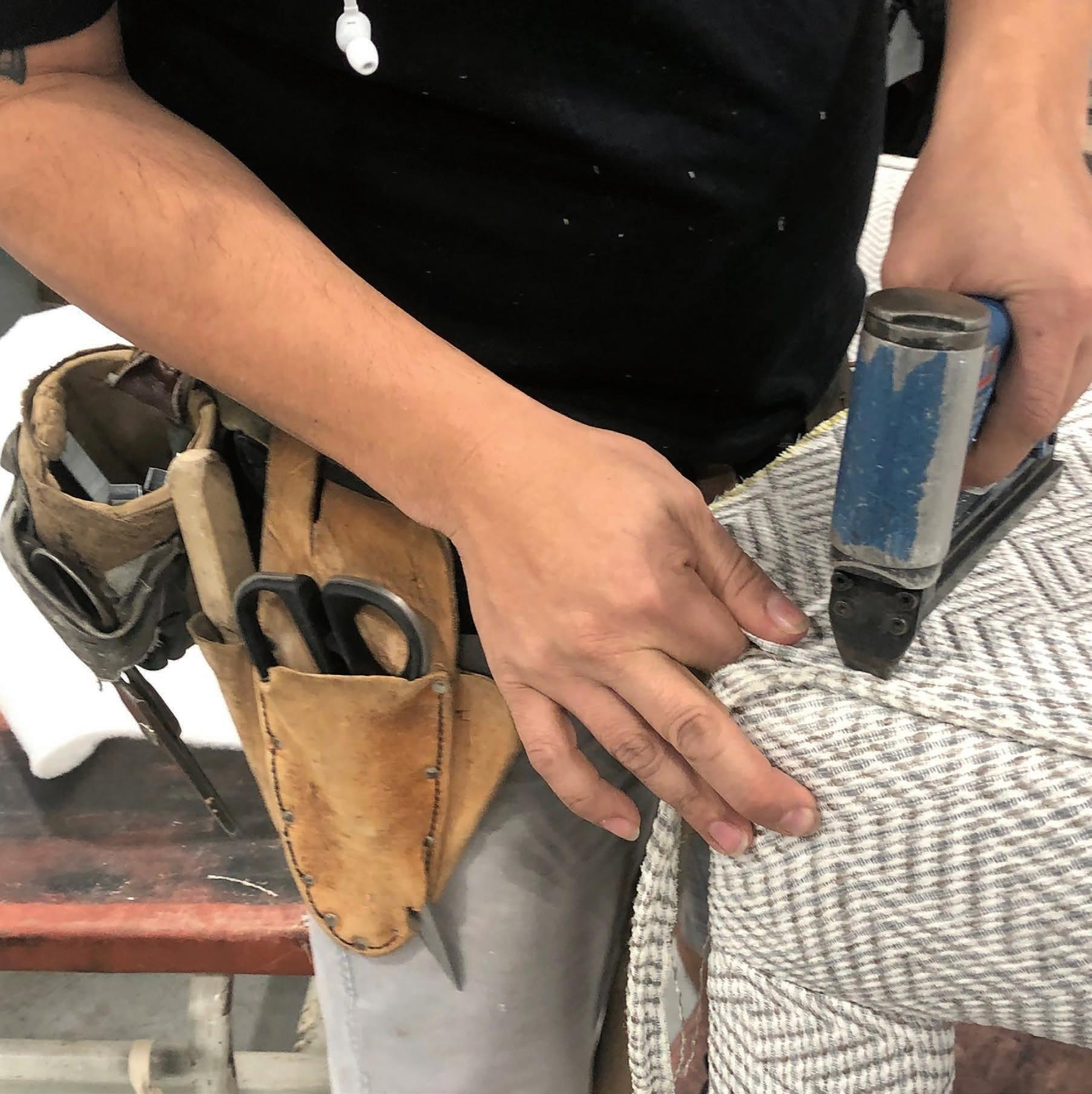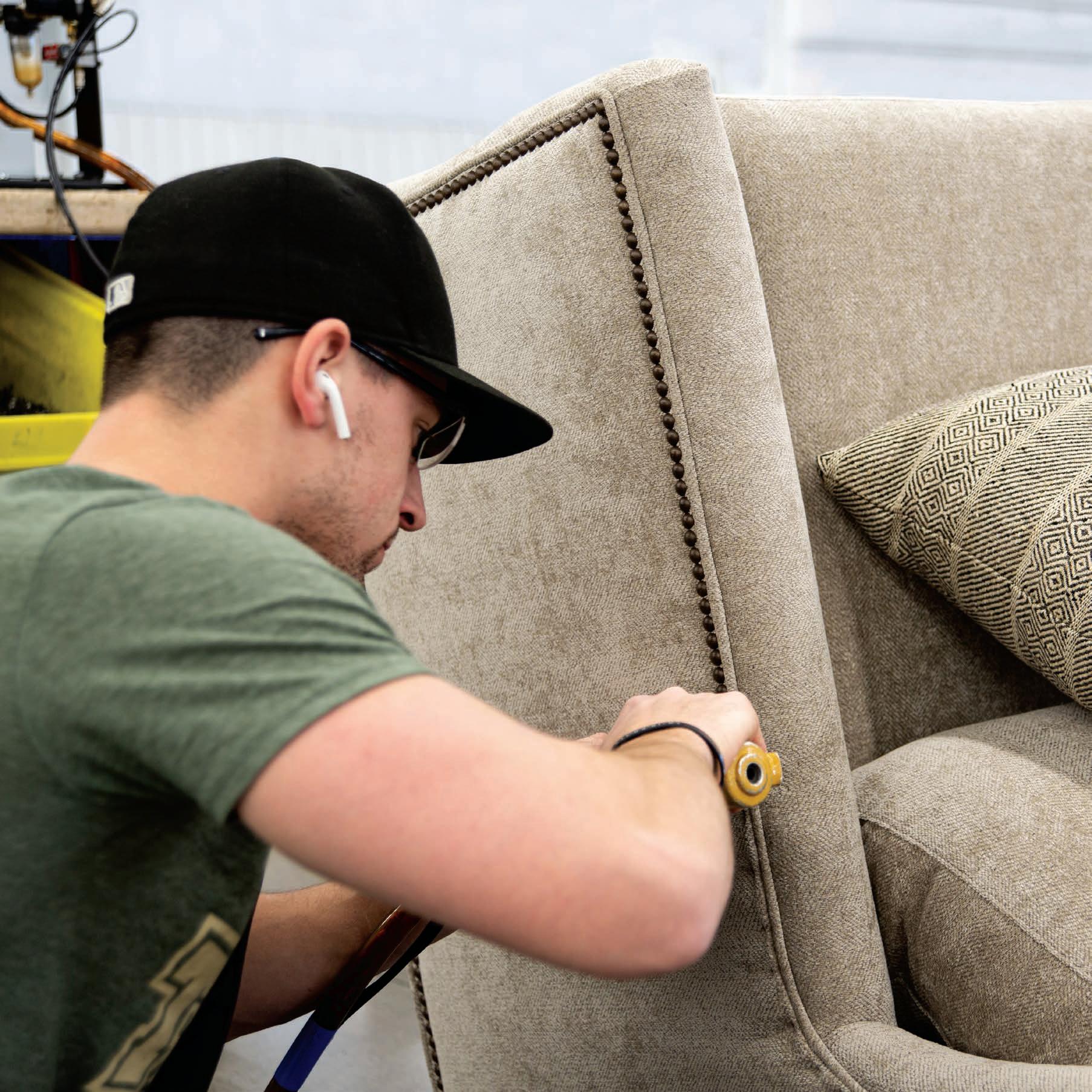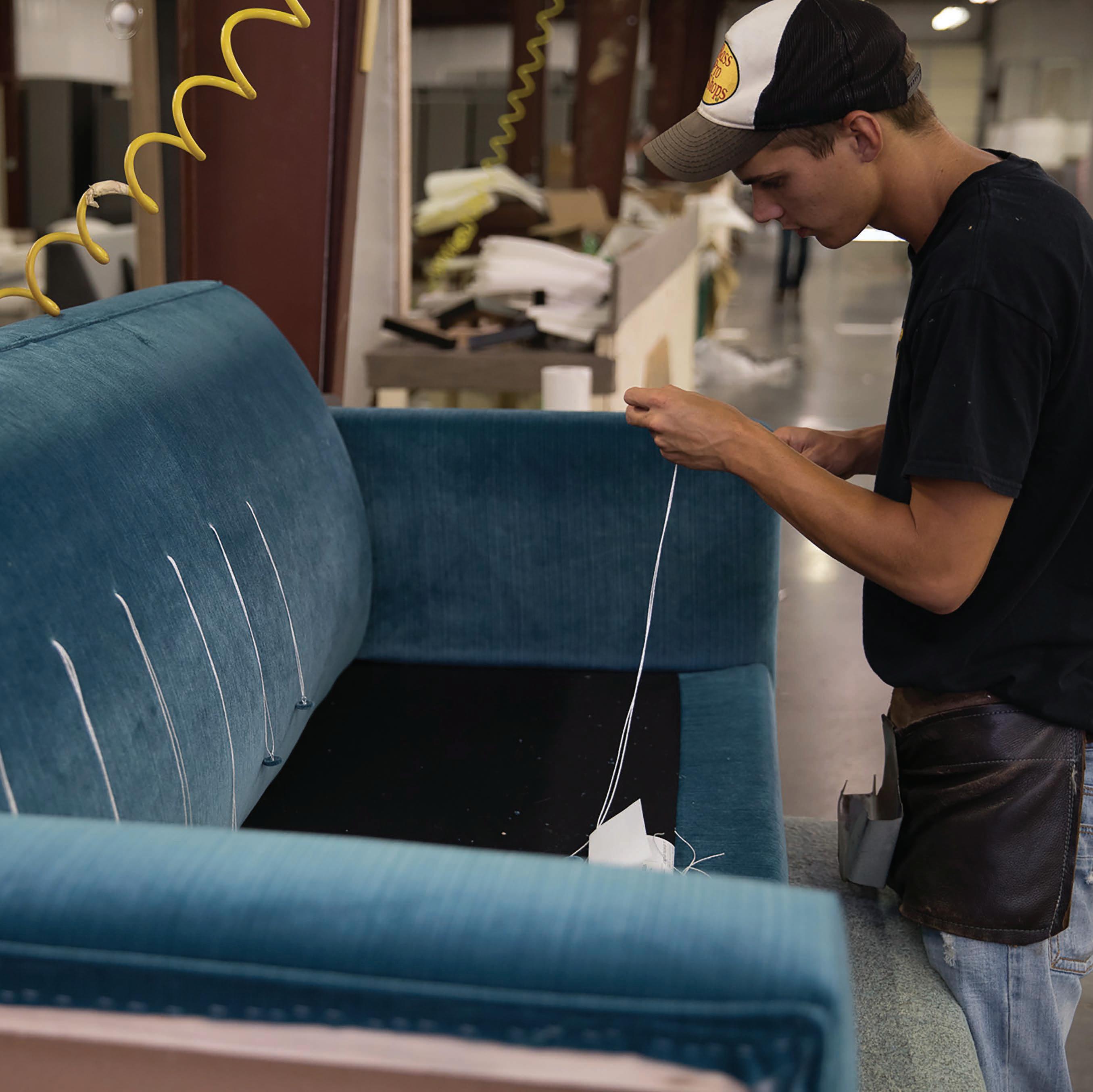 A highly skilled craft that involves padding and covering seats, chairs and sofas with fabric or leather or a combination of both. Each piece of custom upholstery is bench made by hand by a team of experts specializing in their area of expertise. Frames are built to order, and fabric patterns are cut by hand one at a time in such a way that allows the patterns to meticulously flow and match perfectly throughout the entire piece. This is another North Carolina quality process that is widely requested around the world.