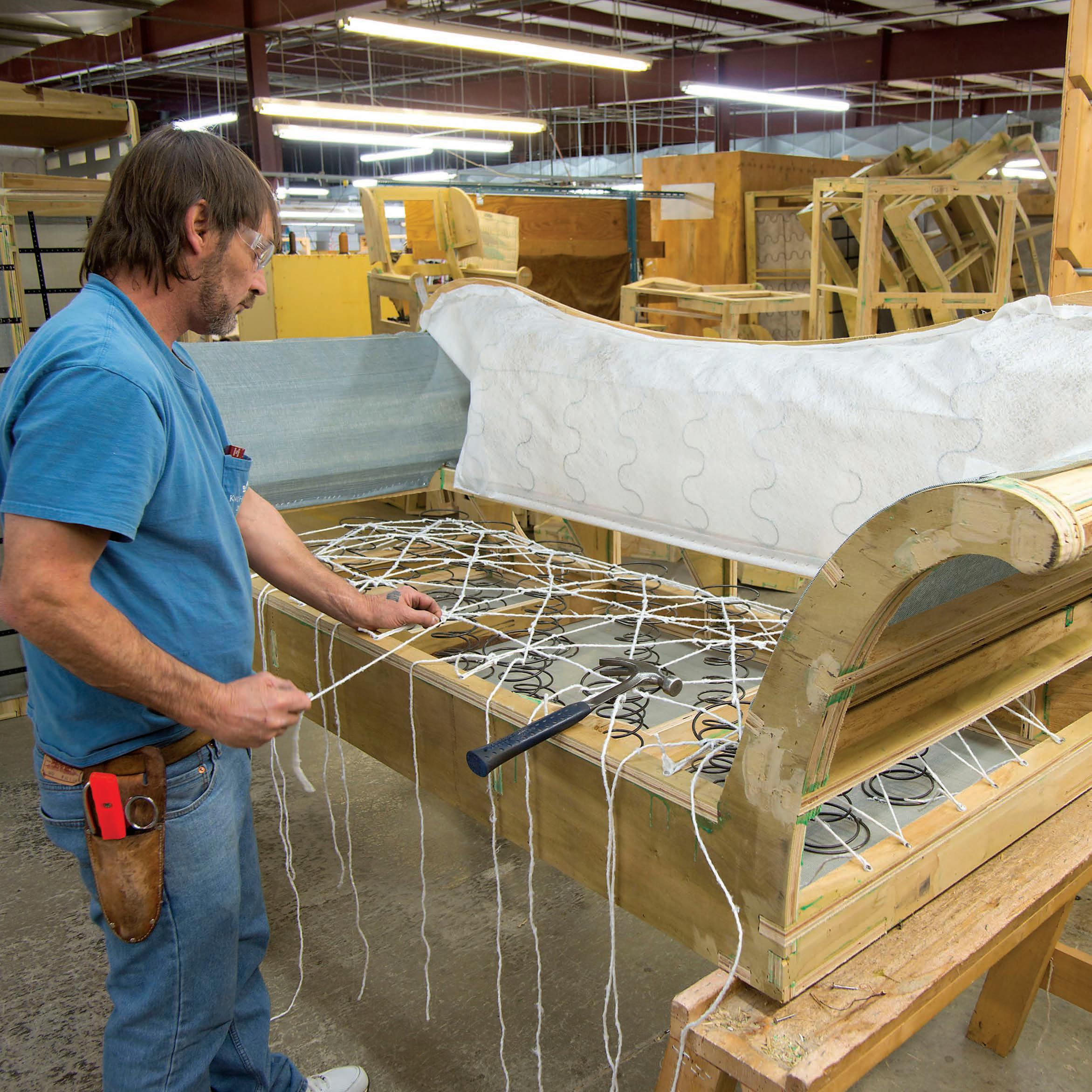 double nailed to the frame. This eliminates the possibility of future sagging. Double cone coil springs are securely nailed to the hardwood frame and then skilled craftsmen tie these springs by hand in eight different directions, from side to side, front to back, and diagonally, which provides outstanding firm support and long-lasting comfort. Truly a North Carolina quality process requested by customers around the world.
