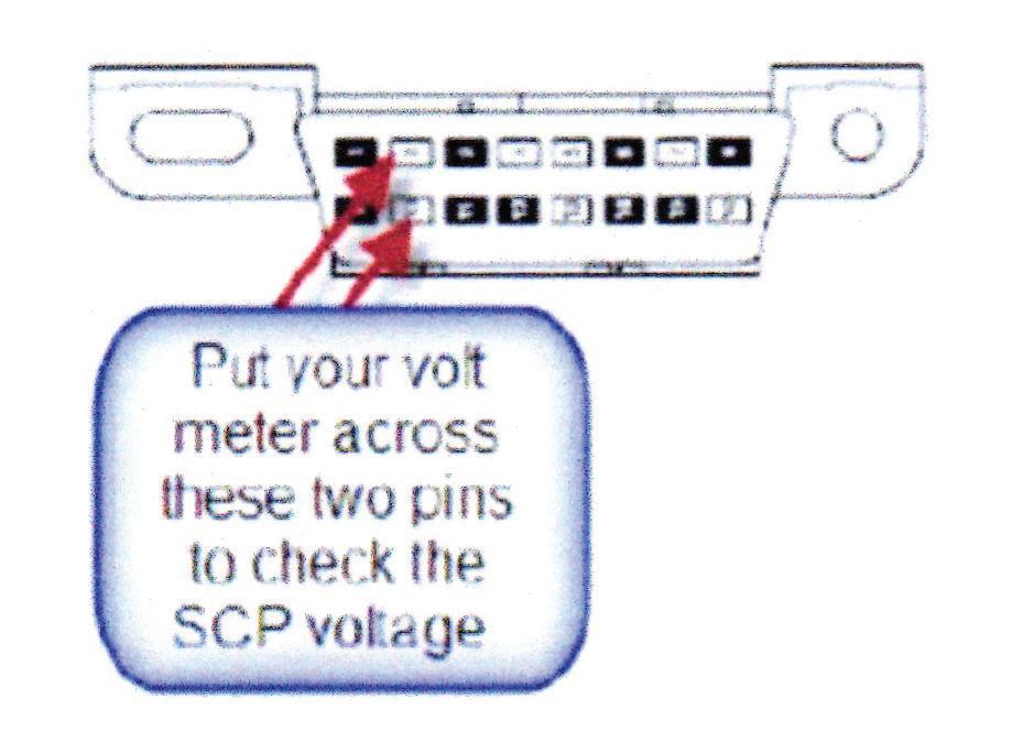 For a quick check of the SCP network, simply place your voltmeter across the SCP pins at the data link connector (top row, second from left and bottom row, second from left).