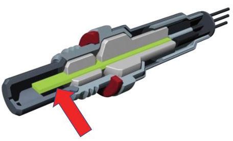 This cut away of a wideband AFR sensor shows the ceramic sensing element (red arrow) that will be used to compare the amount of oxygen in the exhaust to the outside air.