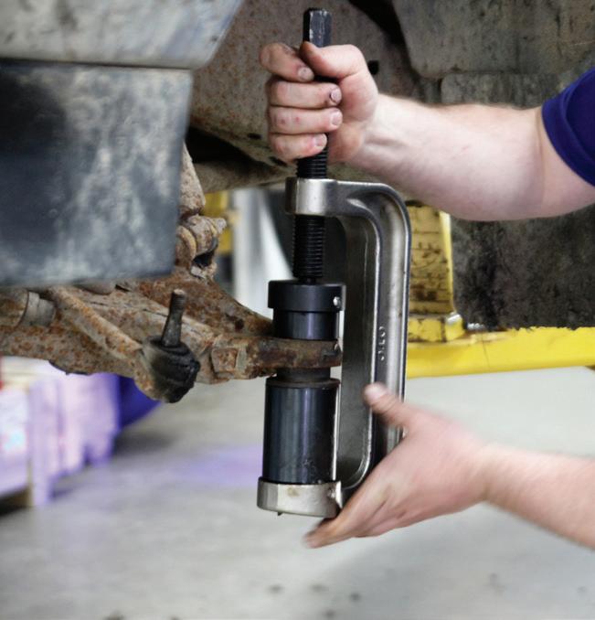 Why would a shop want to use the Connected Adapter Kit? It boils down to versatility and ease-of-use. The extra-large C-frame works on large and small vehicles on more than 600 vehicle applications, from a Honda Civic up to an F-550. The tool is backwards compatible with most cups and adapters that techs might already have and is fully compatible with OTC ball joint cups and adapters. For ball joints, u-joints, and wheel studs, the CA7149 Connected Adapter Ball Joint Starter Kit makes removal and installation faster and easier than before.