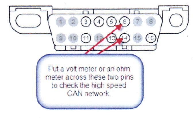 When testing the CAN network, both voltage and resistance can be checked. Place a voltmeter or an ohmmeter across pins 6 and 14 to check the high speed CAN network.