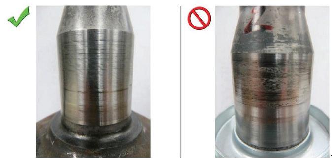 2. Inspect the half shaft journal surface finish. If the journal does not have any metal transfer from the bushing, the half shaft can be reused. Use the service kit that contains only the bushing and seal. If the journal has any metal transfer from the bushing, replace the half shaft. The replace ment bushing with the red Teflon coating on the inside diameter of the bushing allows for the reuse of the original half shaft if the half shaft journal does not show any metal transfer from the original bushing.