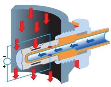 The red arrows show the exaust flow across the porous precious metal coated O2 sensor tip. The blue arrow represents the fresh air that will be used to compare the amount of oxygen in the exhaust by diffusion.