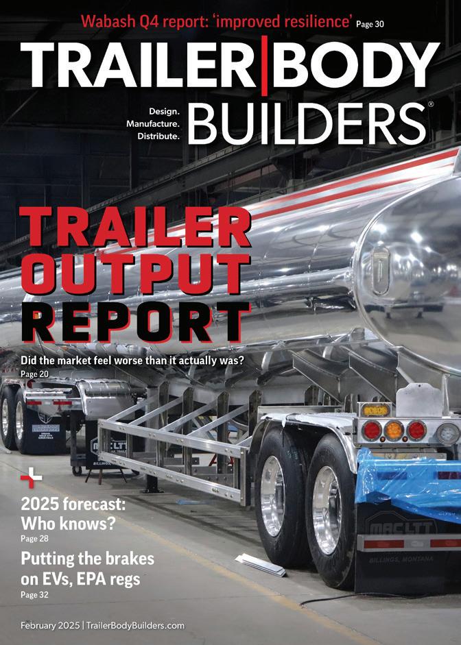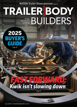 SUBSCRIPTIONS: Publisher reserves the right to reject nonqualified subscriptions. Subscription prices: U.S. ($79 per year); Canada/Mexico ($79 per year); All other countries ($157 per year). All subscriptions are payable in U.S. funds. Send subscription inquiries to Trailer/Body Builders, PO Box 3257, Northbrook, IL 60065-3257. Customer service can be reached toll-free at 877-382-9187 or at trailerbodybuilders@ omeda.com for magazine subscription assistance or questions. Printed in the USA. Copyright 2025 Endeavor Business Media, LLC. All rights reserved. No part of this publication may be reproduced or transmitted in any form or by any means, electronic or mechanical, including photocopies, recordings, or any information storage or retrieval system without permission from the publisher. Endeavor Business Media, LLC does not assume and hereby disclaims any liability to any person or company for any loss or damage caused by errors or omissions in the material herein, regardless of whether such errors result from negligence, accident, or any other cause whatsoever. The views and opinions in the articles herein are not to be taken as official expressions of the publishers, unless so stated. The publishers do not warrant either expressly or by implication, the factual accuracy of the articles herein, nor do they so warrant any views or opinions by the authors of said articles.