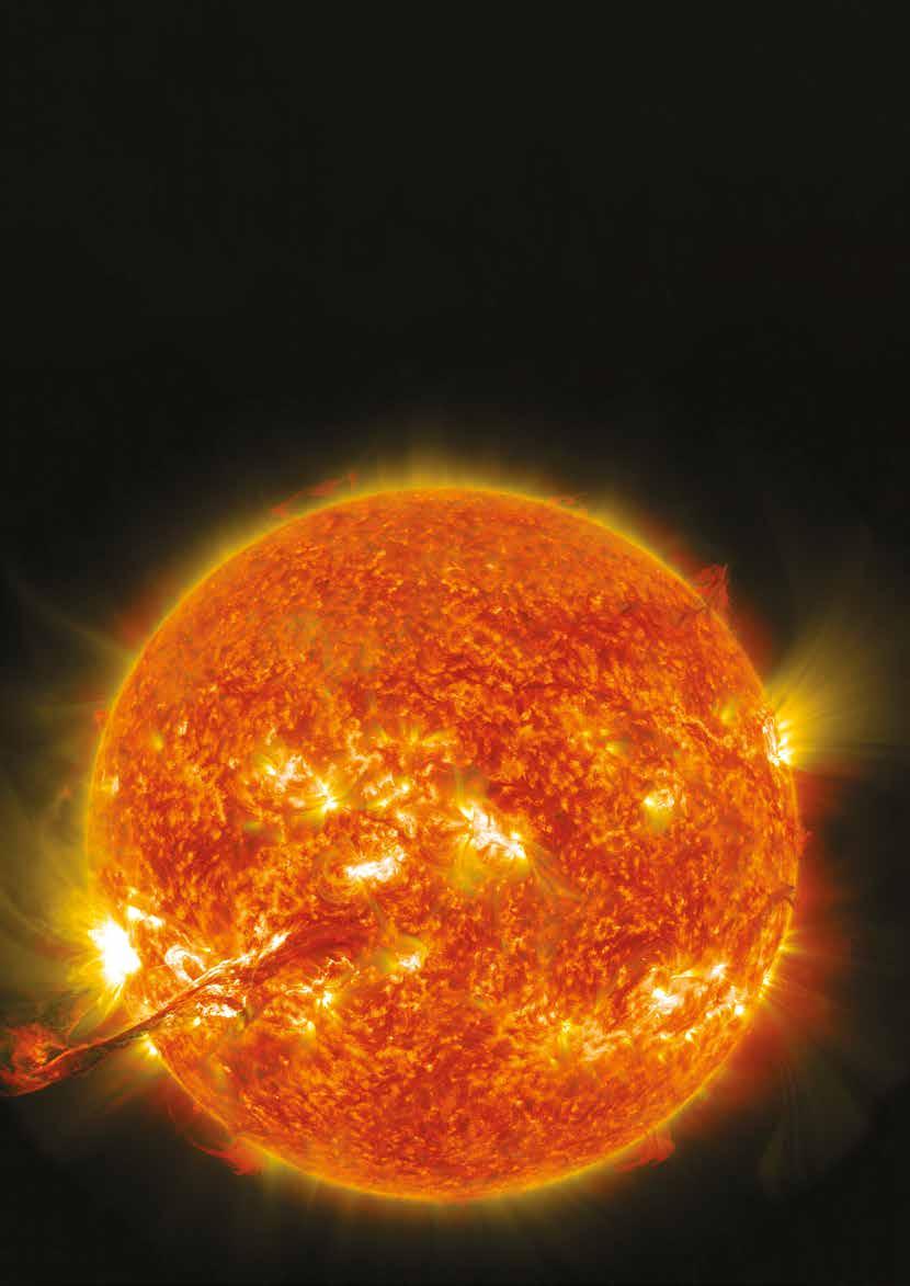 On the sun, the energy produced by fusion radiates outward, providing energy to the solar system through what we see as sunlight.