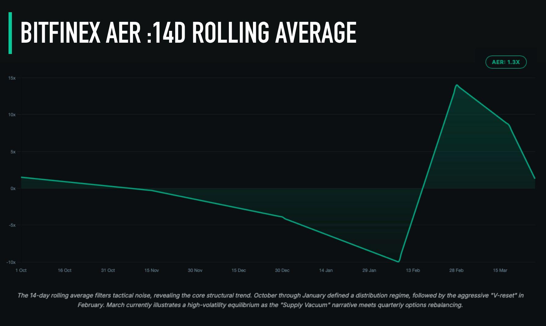 Bitfinex 吸收-發行比率(AER)的 14 日滾動均值,衡量機構 ETF 及直接吸收需求相對於 礦工每日增發量的比率,目前報 1.3 倍。這較 2 月底的峰值約 5.3 倍,不到六週已累計崩 跌逾 75%,標誌著需求強度的急劇惡化。