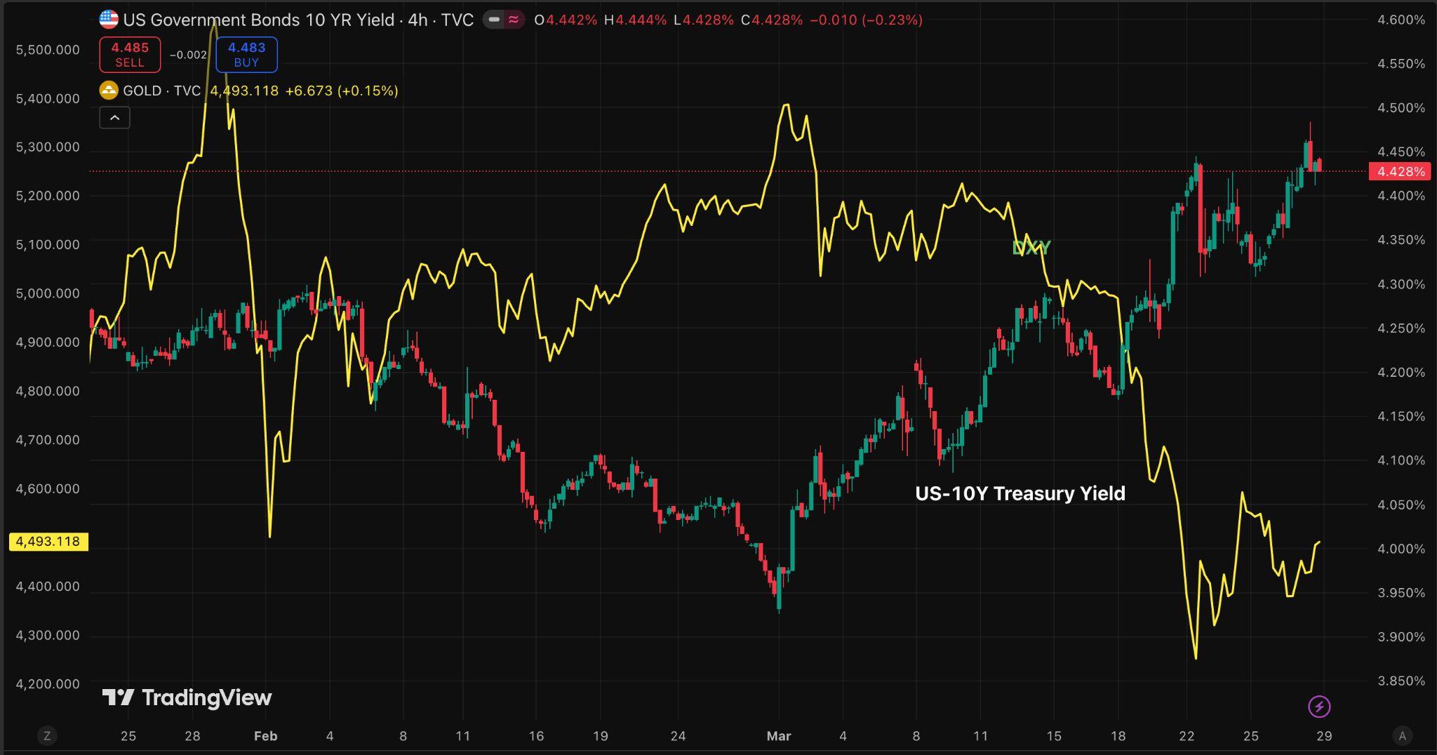 油價走強與美元升值拉低了黃金需求,兩者同步強化了市場對聯準會可能更長時間維持 高利率的預期。簡言之,當利率上升,投資人可從債券等資產獲得更優厚的回報,使黃金 這類無息資產的持有吸引力相應下降。與此同時,美國勞工部的失業救濟申請數據顯示勞 動市場依然穩定,為聯準會維持現有政策立場提供了空間。