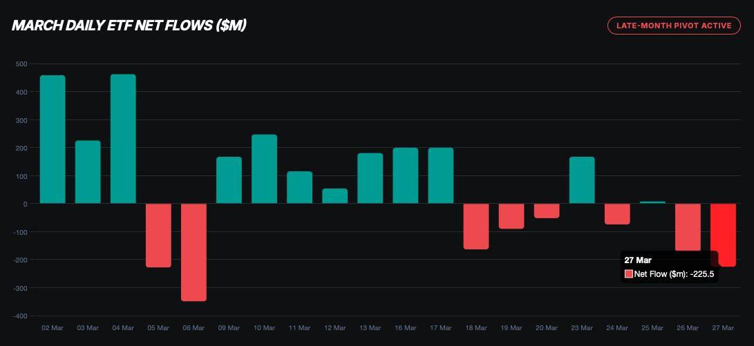 每週 ETF 數據提供了最為清晰的行為訊號。繼 3 月 10 日至 17 日連續五個交易日的淨流 入(合計約 9.94 億美元)之後,ETF 整體出現急劇逆轉。3 月 23 日至 27 日當週以淨流出 2.963 億美元收場。