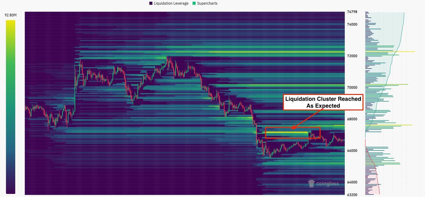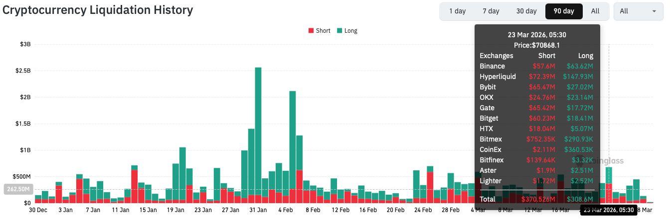 3 月 23 日的初步上行動能,由逾 3.7 億美元的空頭爆倉所引爆,為一個月來最大規模。 此舉一度將價格短暫推入 $72,000 區間高點附近的爆倉密集區。