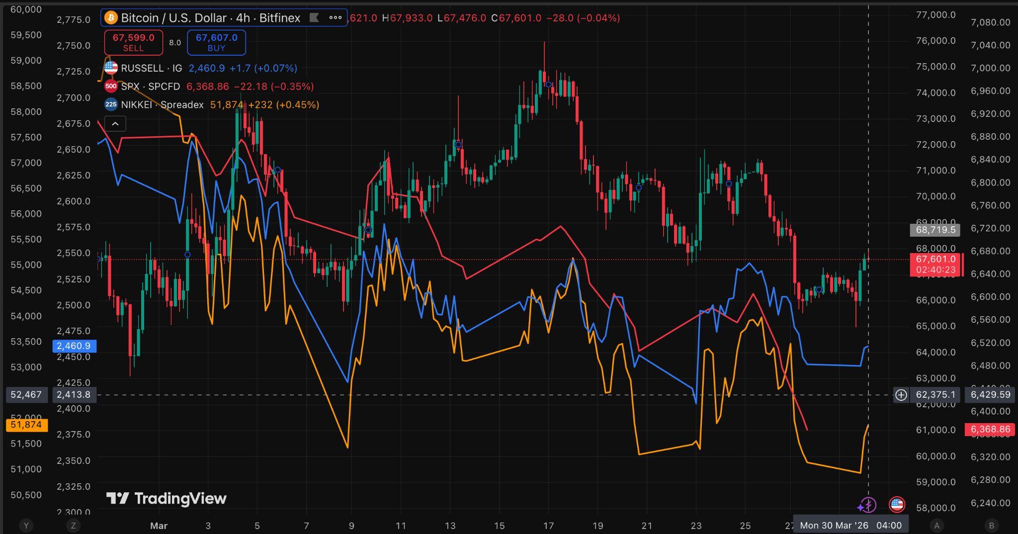 圖十一.BTC/USD、標普 500、日經指數、羅素指數(資料來源: TradingView)