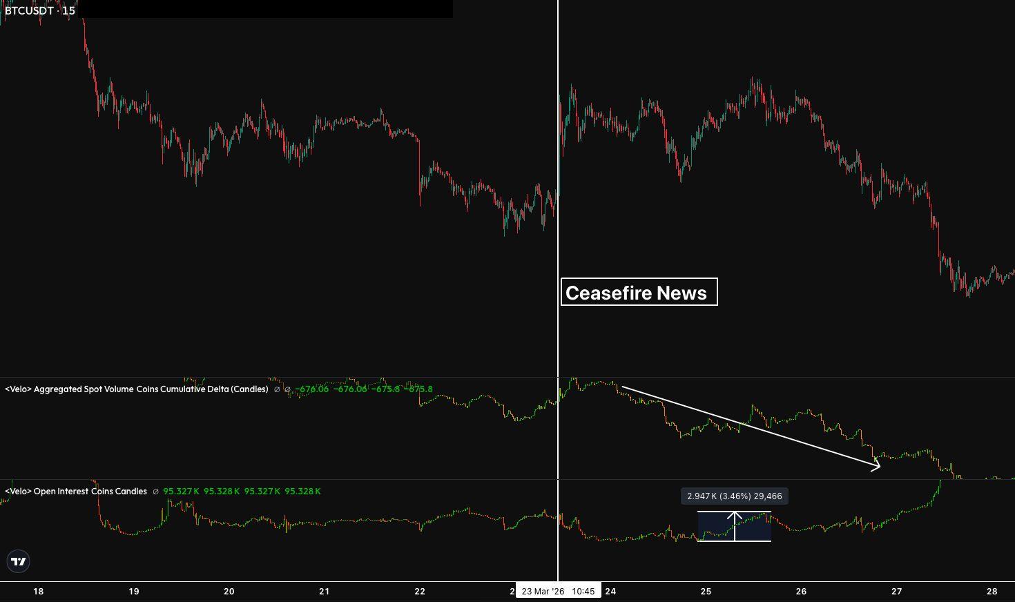 在 $68,000$72,000 以上區間,現貨的積極買盤已停止甚至逆轉,顯示一旦價格交投於 當前區間上半段(溢價區域),買盤興趣便迅 消退。3 月 23 日的大部分上漲主要由空頭 爆倉驅動,致使未平倉合約較歷史高點仍低逾 55%。值得注意的是,在伊美雙方行政當局 發表一系列相互矛盾的聲明後,新的永續合約多倉在 3 月 24 日追漲 $70,000 以上的開 盤,而現貨賣方卻在彼處持續分貨,最終導致本週漲幅全數回吐。