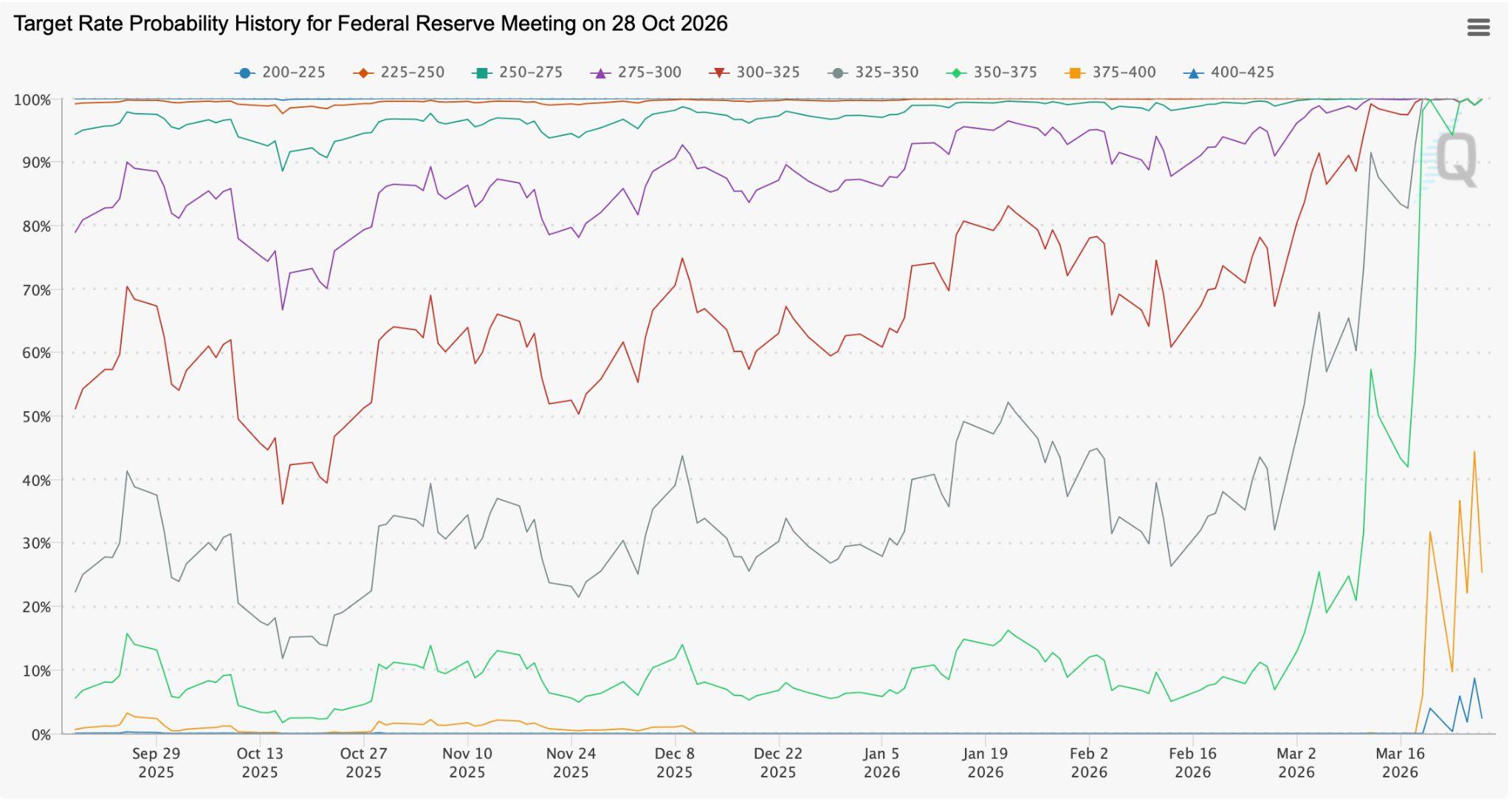 聯準會當前面臨結構性困境。聯邦基金利率期貨已定價 2026 年 10 月前升息的可能性接 近 50%,與年初市場視為共識的連續降息路徑完全背道而馳。