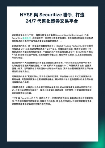 ● NYSE 與 Securitize 聯手,打 24/7 代幣化 證券交易平台