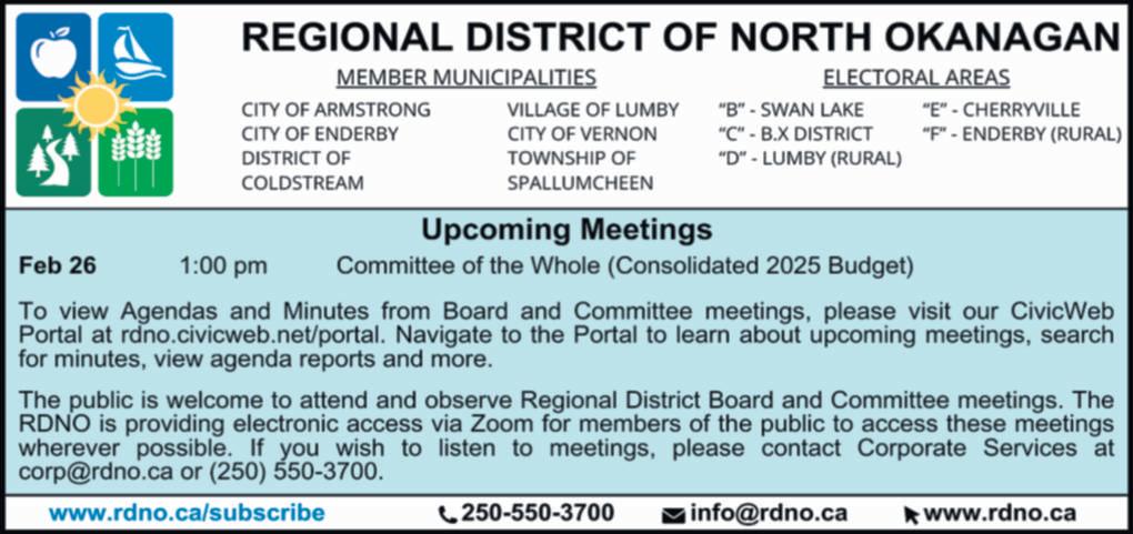 Forquestionsabouttheproposedbylaw,pleasecontactthe PlanningandCommunity ServicesDivision attheCommunityServicesBuilding,300132ndAvenue,Vernon,BC orcall250-550-3634.Copiesofthebylawandrelateddocumentsareavailableforreview MondaytoFriday,8:30a.m.-4:30p.m.(excludingstatutoryholidays)fromFebruary6, 2025toFebruary24,2025.