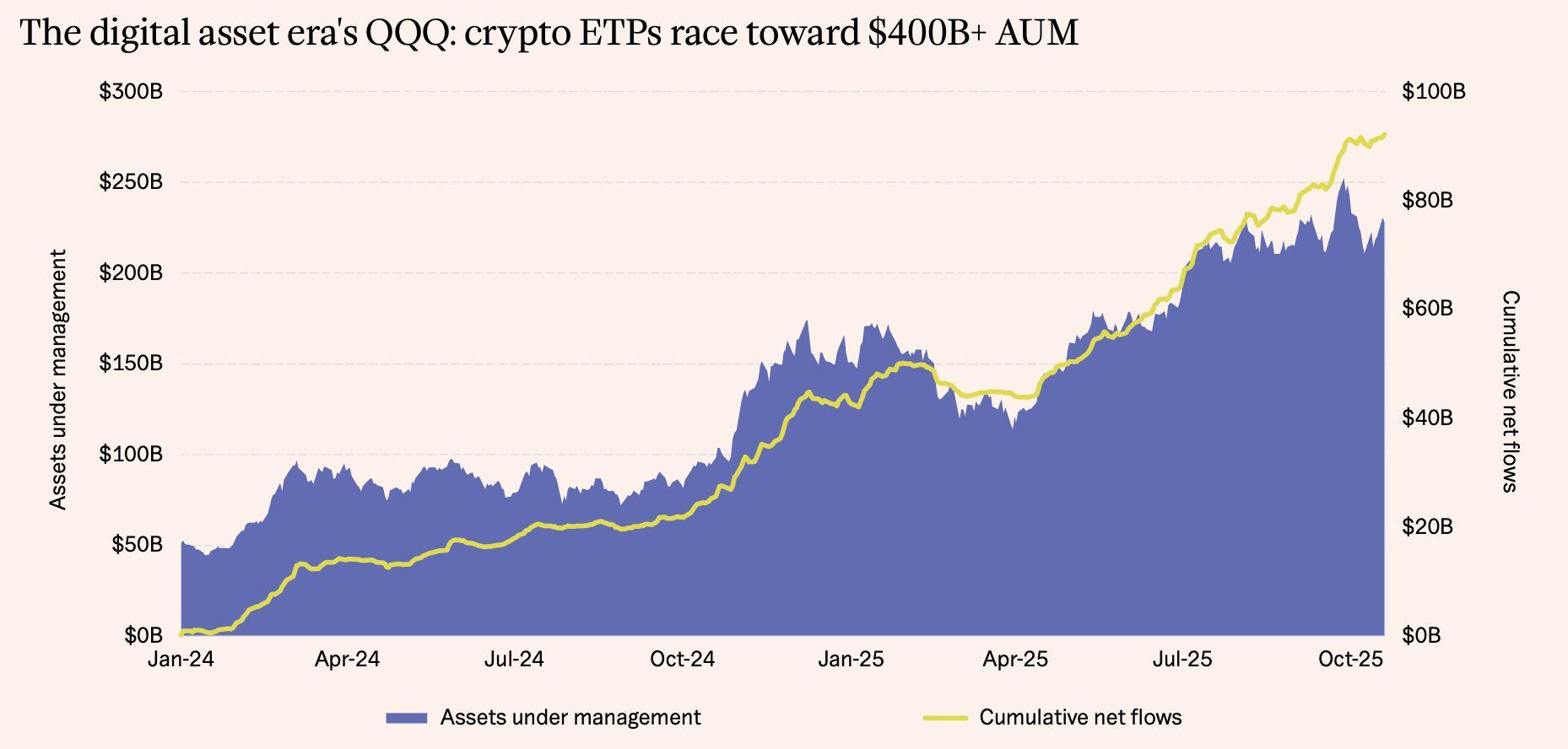 Cryptoexchange-tradedproductsETPshaverapidlyemergedastheprimary access point for traditional investors seeking exposure to digital assets.Last year,weprojectedthatglobalcryptoETPswouldsurpass$250billioninassets under management AUM) at their peak — a milestone that was briefly achievedinOctober2025.Lookingahead,weexpectthisgrowthtrajectoryto acceleratefurther,withglobalcryptoETPAUMontracktoexceed$400billion by the end of 2026, potentially overtaking the size of the Nasdaq-100 ETF QQQ,oneofthelargestandmostestablishedequityETFsglobally.