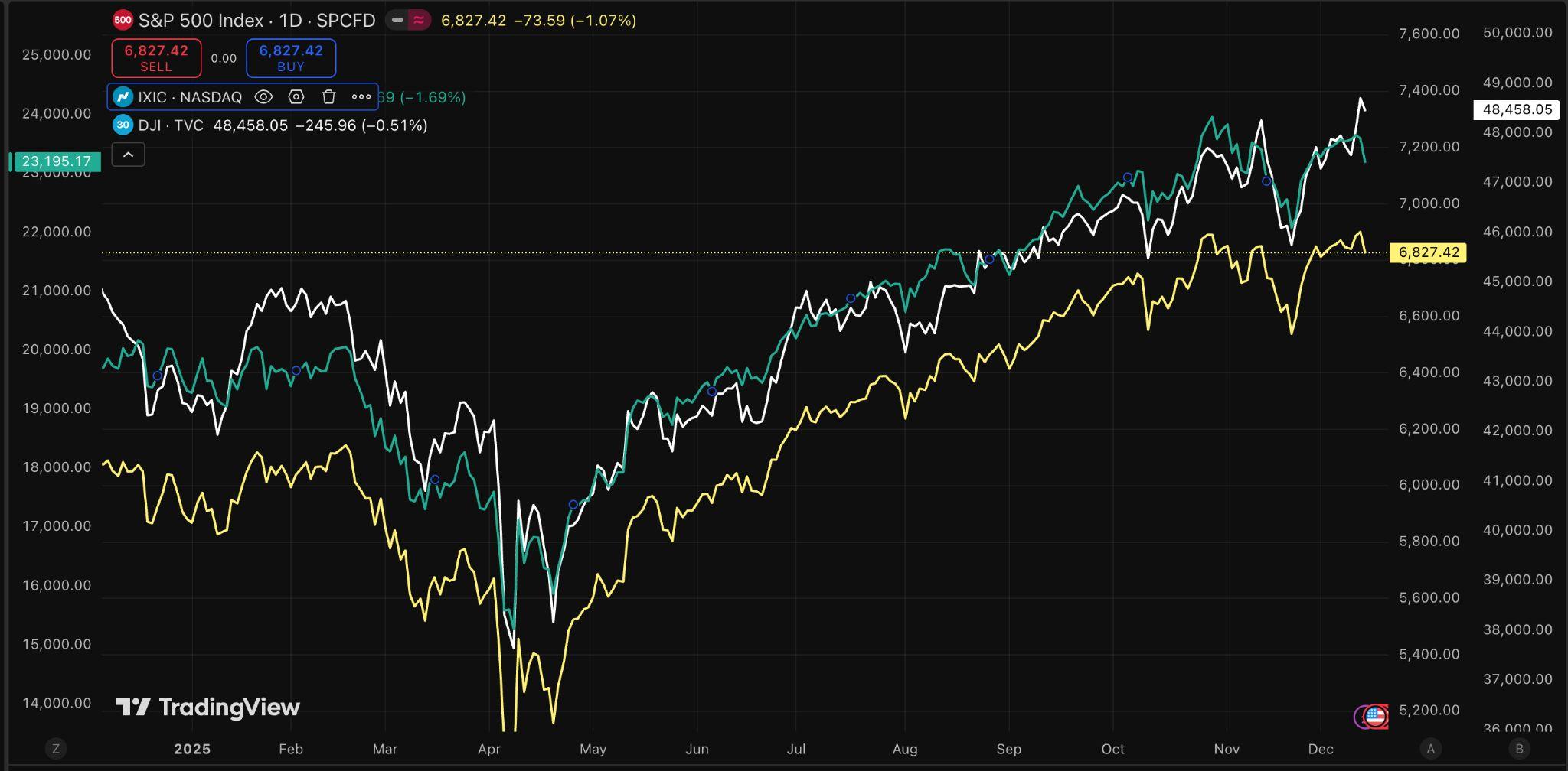 In 2025, US stocks rallied significantly, with large-cap indices hitting record highs by year-end. The S&P 500 gained roughly 19 percent YTD, the Nasdaq Composite about 21 percent, and the Dow roughly 14 percent. Equities staged a notable early-yearsell-offontrade/tariffjittersandstalledgrowth,butreboundedstrongly thereafter. Key catalysts included disinflationary pressures, Federal Reserve rate cuts, strong corporate profits, and renewed investor enthusiasm for AI-driven technology.