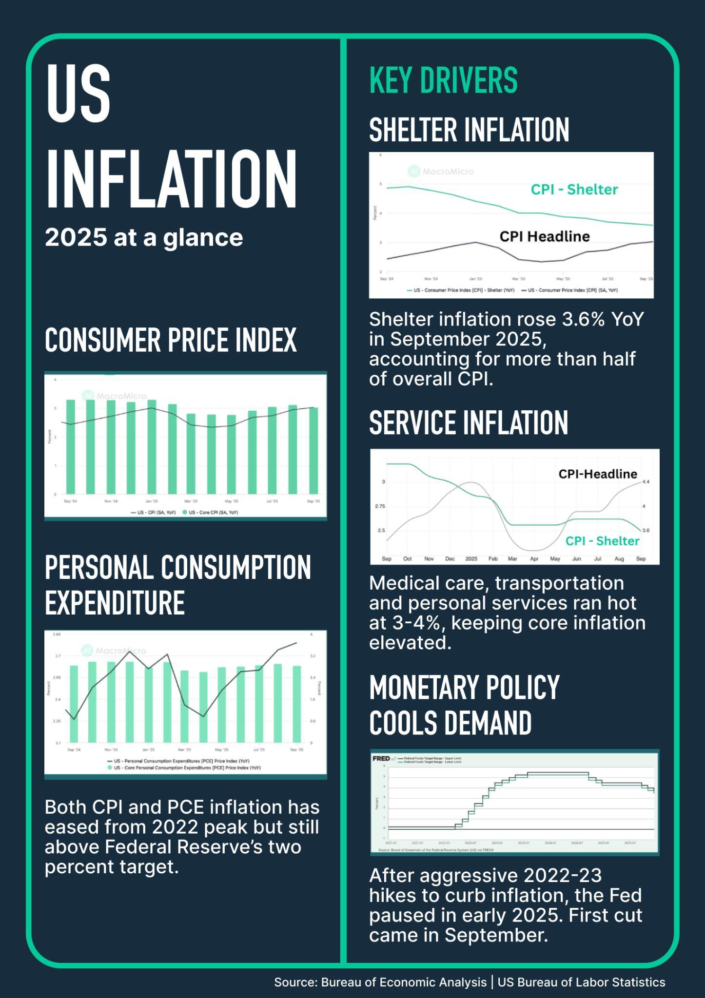 ShelterandHousingCosts:These werethesinglelargestcontributorstoinflation in 2025. As of September, shelter prices were up 3.6 percent year-over-year. Because housing carries a significant weight in consumer baskets, it ended up accountingforabout1.7percentagepointsoftheoverall3percentoverallinflation rate in 2025 - an indication of how much shelter costs accounted for overall inflation.