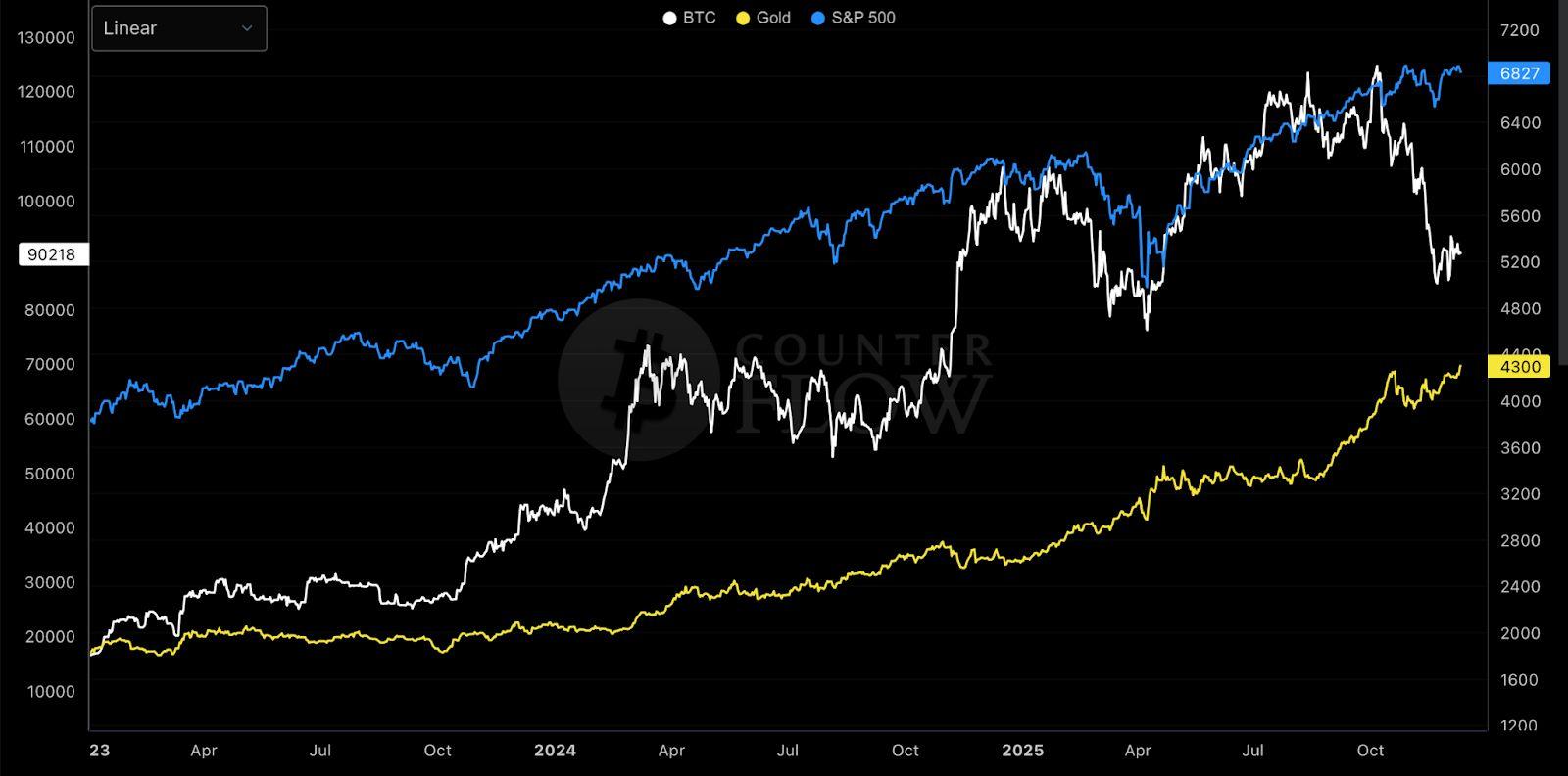 TheprecedingchapteroutlineshowBitcoinandthebroaderdigitalassetmarket havematuredintomacro-scaleassets.Asaresult,correlationswithtraditional macro hedges, particularly gold, have become increasingly relevant. At this stageofmarketdevelopment,assessingBTCʼsbehaviourrelativetosafe-haven assets,rather than focusing narrowly on equity correlations,provides a more robustframeworkforunderstandingcycledynamics.