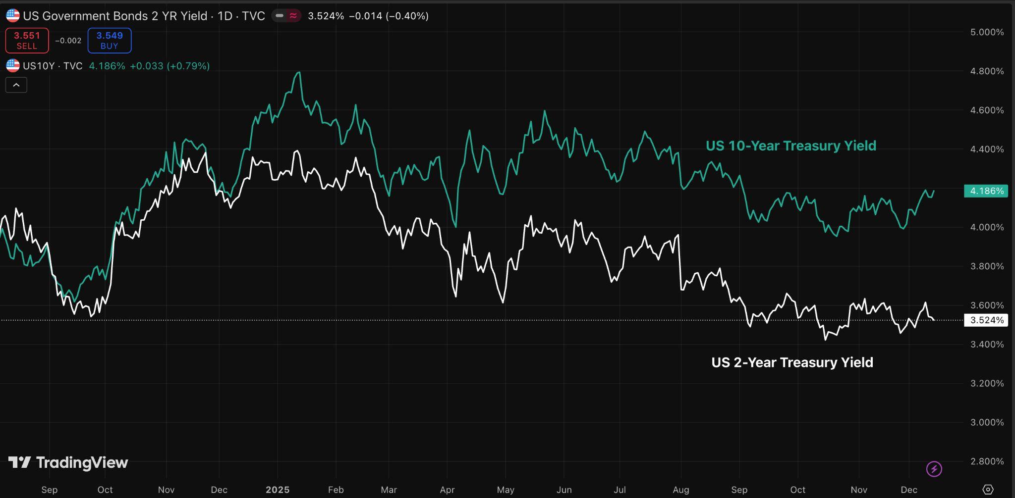 Meanwhile,US Treasury yields trended lower over 2025. In January, the 10-year yield peaked near 4.8 percent, fueled by elevated inflation expectations and fiscal deficits. But as the Fed paused and then began cutting rates, yields eased. By mid-December, the 10-year yield was about 4.14 percent and the 30-year around 4.79percent.Short-termratesfellevenmore:thetwo-yearyield,whichhadbeen roughly4.28percentearlyintheyear,droppedtoabout3.5percentbyDecember 12.Insum,theyieldcurvesteepened,withshortratesfallingfasterthanlongrates, asdisinflationtookholdandtheFederalReserveshiftedtowardeasierpolicy.