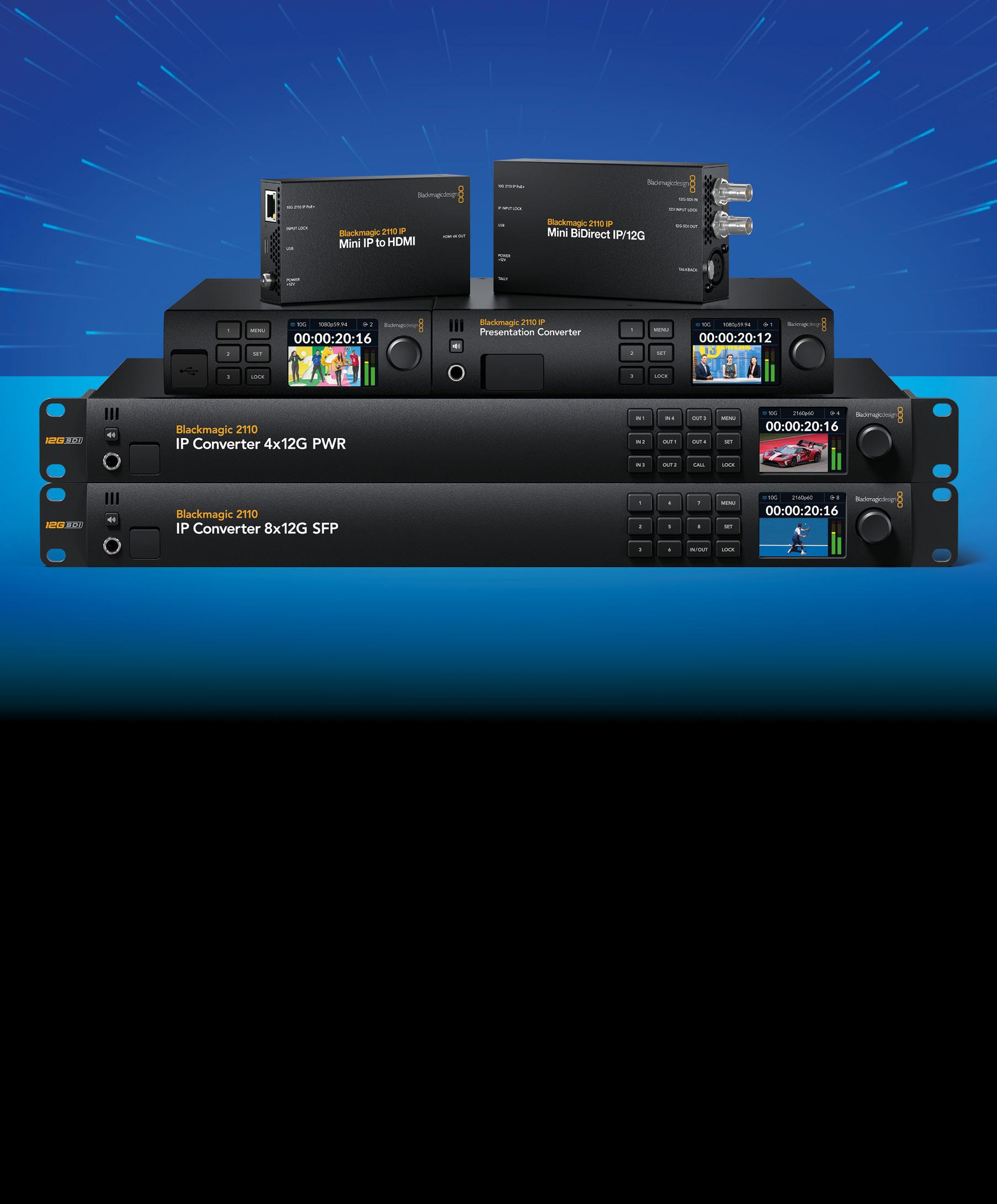 Now you can build affordable live production and broadcast systems with SMPTE-2110 video! Blackmagic Design has a wide range of 2110 IP products, including converters, video monitors, audio monitors and even cameras! You get the perfect solution for intergating SDI and IP based systems. Plus all models conform to the SMPTE ST-2110 standard, including PTP clocks and even NMOS support for routing.