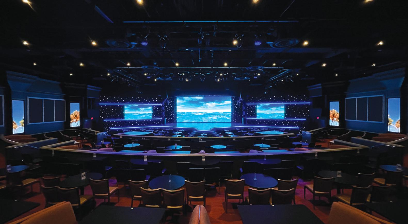 The crown jewel of the new Strat Theater is a fully immersive 11-screen Taylorleds video system from ATS-Pro. The main video wall spans the entire width of the stage, with two flanking displays completing the forward view. Four additional displays extend down each side, fully enveloping the audience in stunning 4K detail.