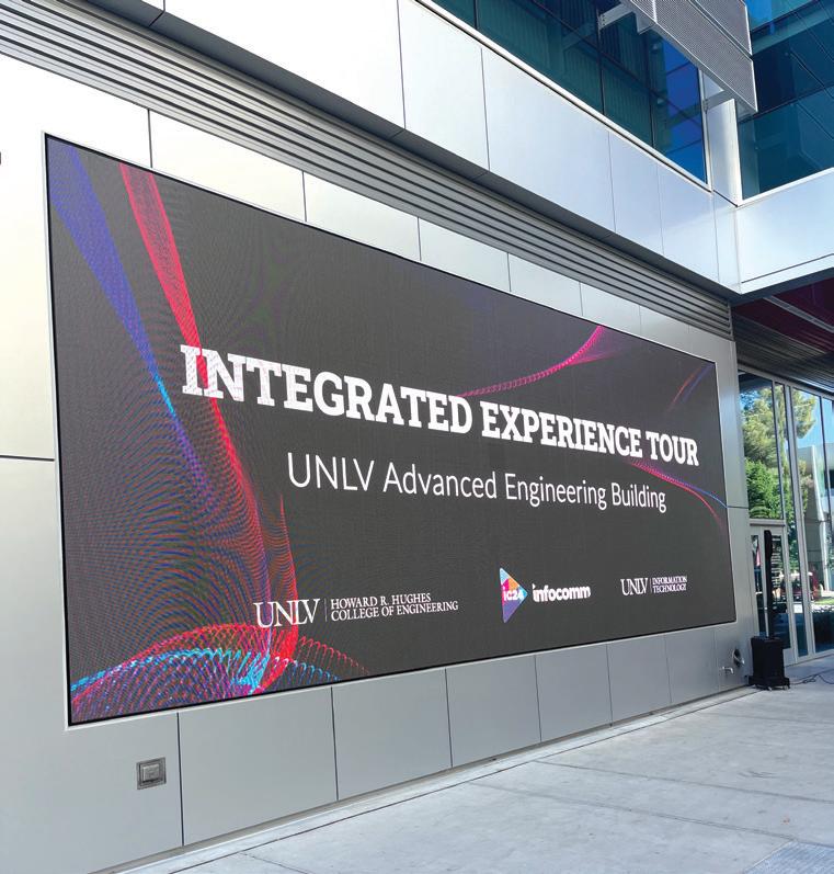 Complete in February 2024, the building is the newest of four interconnected engineering buildings on campus—the largest growing major at UNLV. Located next to a 10,000-spot parking deck, the area is a main thoroughfare on the North side of campus, and having something that grabs the attention of students, teachers, and visitors was a must. “It’s Vegas, right?” said Frank Alaimo, manager of classroom technology at UNLV. “On the strip you have got signage everywhere. This was a prime spot for it.” A 39-outdoor-pitch Nanolumens video wall, one of three in the new building, adorns the outside of the building.
